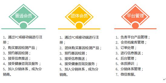 平臺通過微信申請微信服務公眾號,平臺和微信端通過集成開發,最終通過實現微信實現會員的關注、即時獲取信息推送并提交在線服務需求,具體功能包括:- 實現基因檢測產品的在線宣傳展示、在線申請和支付、朋友圈分銷并獲得推薦成功的獎勵;