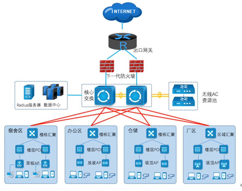整個(gè)組網(wǎng)架構(gòu)采用瘦AP組網(wǎng)架構(gòu),在不改變?cè)薪M網(wǎng)鏈路的基礎(chǔ)上,將無線控制器旁掛在廠區(qū)核心交換機(jī)上,通過局域網(wǎng)聯(lián)路統(tǒng)一管理各個(gè)區(qū)域的無線AP,同時(shí)在出口部署防火墻,保障整個(gè)廠區(qū)出口鏈路的網(wǎng)絡(luò)安全。