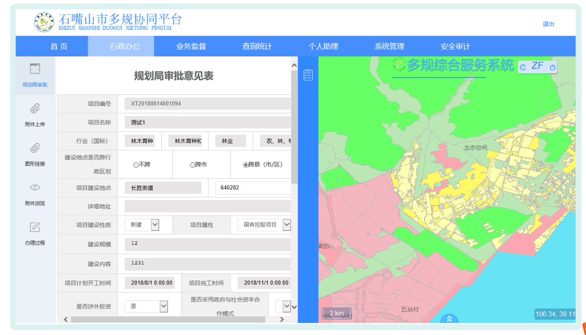為政務審批提供基礎數據,在審批中能實時查詢地塊圖形,進行項目紅線地塊拓撲分析、屬性統計、自定義專題任意范圍分析匯總出表等。