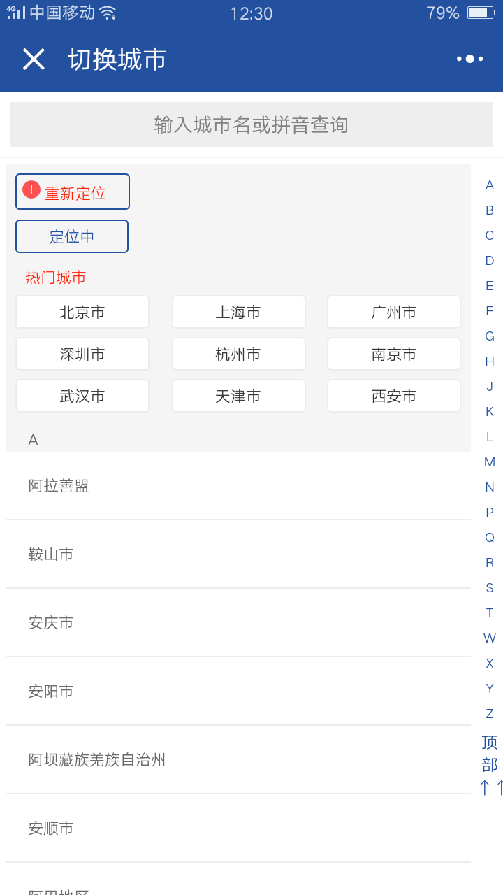 2)切換城市頁面,更新公共變量中城市信息為手動切換的城區(qū),再switchTab回到首頁,觸發(fā)首頁重新加載。