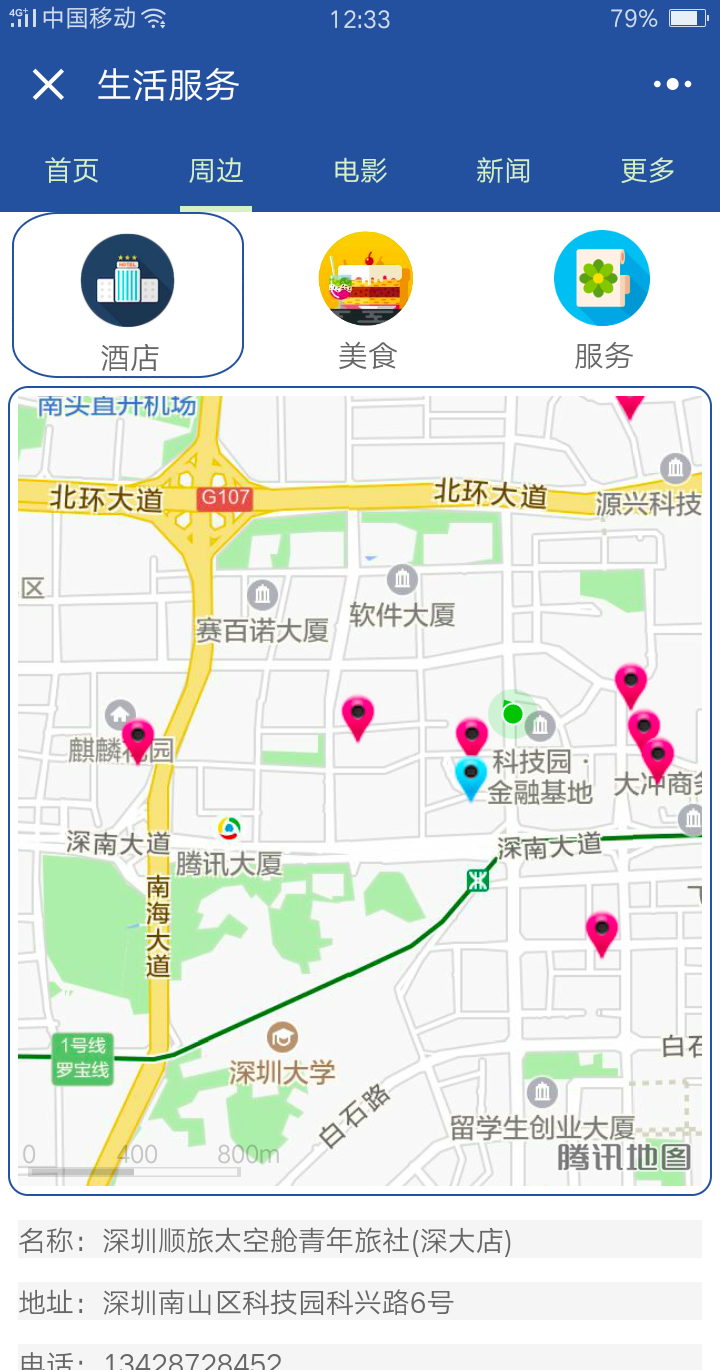 (1)調(diào)用百度地圖的各種服務(wù),查詢酒店,美食,生活服務(wù)三種信息,更多信息可以看百度地圖的文檔