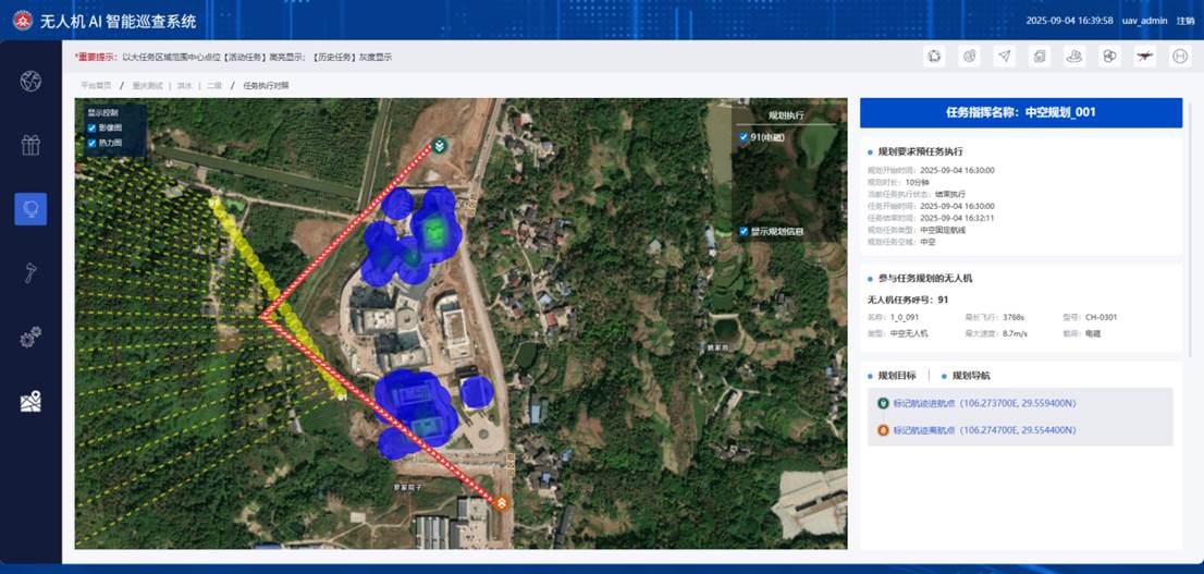 系統更構建“巡查 - 記錄 - 復盤”閉環:AI 自動存儲數據,生成熱力圖與隱患趨勢報告。應急勘察后,災害點數據快速歸類,為后續處置提供精準依據,杜絕重復巡查。首頁概覽一屏盡覽巡查進度、識別結果與無人機狀態,值警日志毫秒級記錄關鍵操作,全局動態實時掌控,決策永不滯后。